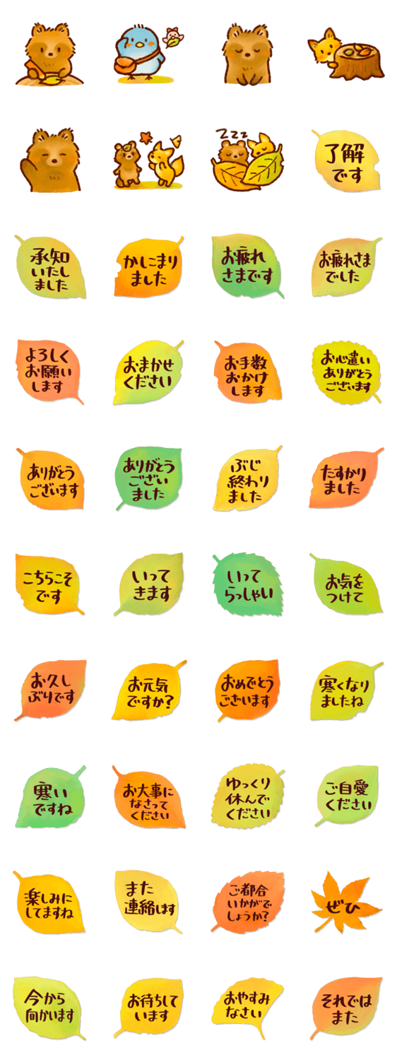 敬語多めのデカ文字スタンプです。 お久しぶりです、お元気ですか、寒いですね、ご自愛ください、お手数おかけします等。 たぬき/きつね/鳥/紅葉/イチョウ/水彩/秋/冬