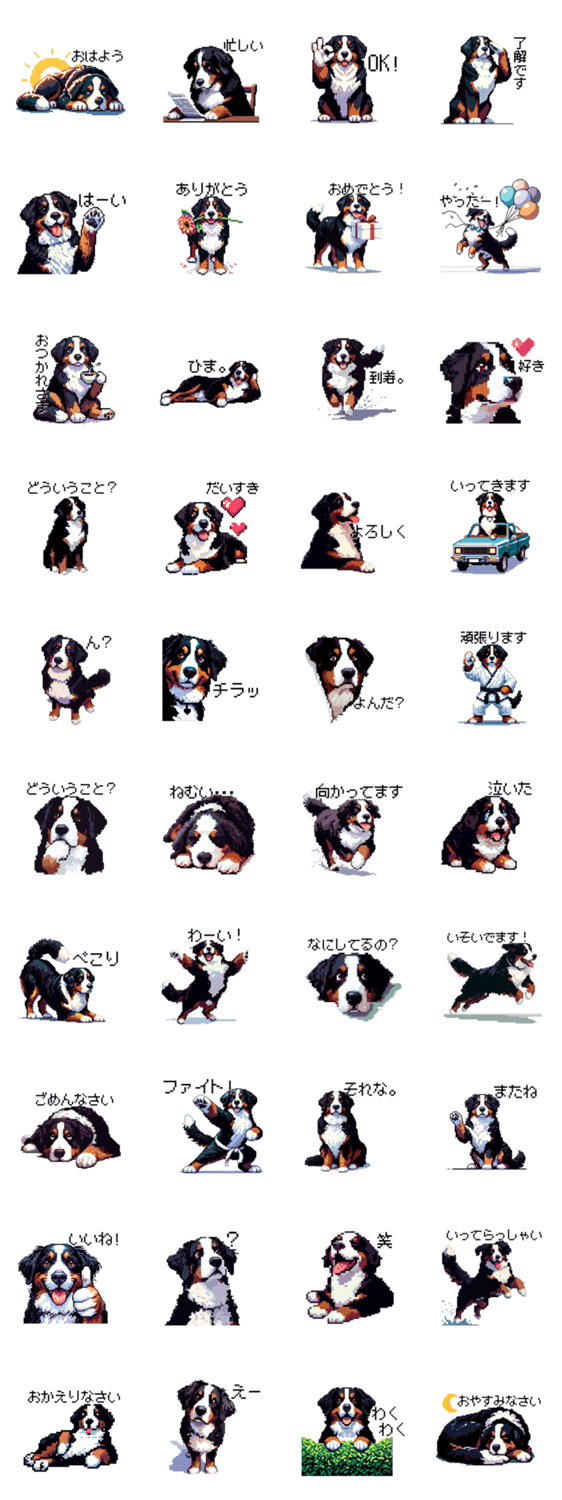 日常会話40種のドット絵で描いたバーニーズマウンテンドッグ。