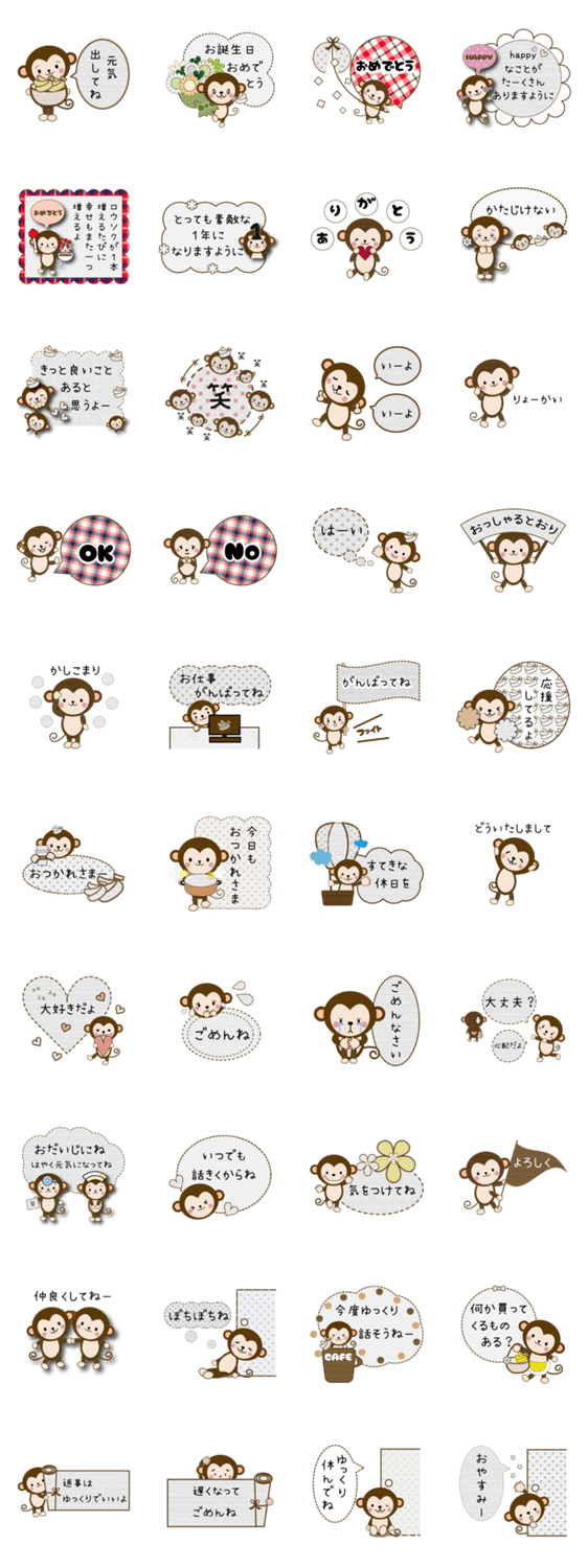 可愛いお猿さんのスタンプ。思いやりのある言葉を集めました。