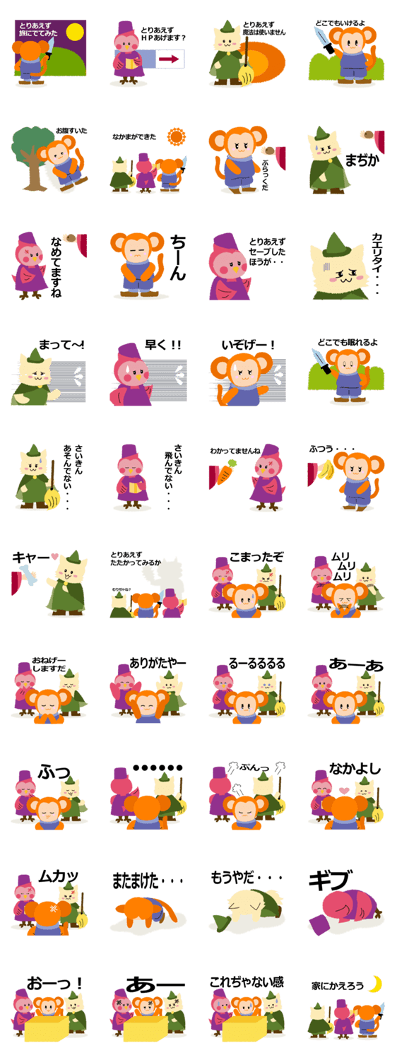 桃太郎のお伴「さる」「きじ」「いぬ」の冒険をRPG風のスタンプにしました。かわいい三匹の大冒険です。