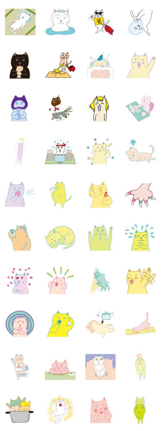 カラフルでかわいい猫たちのスタンプです。日常生活に使えるものをそろえました。たくさん使ってください!