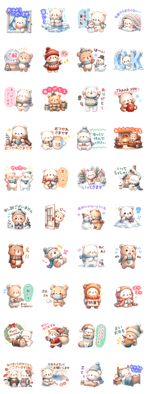 いろんなクマさんを集めた冬のスタンプです。 (熊(くま)・日常・挨拶・敬語・クリスマス・大晦日・お正月)