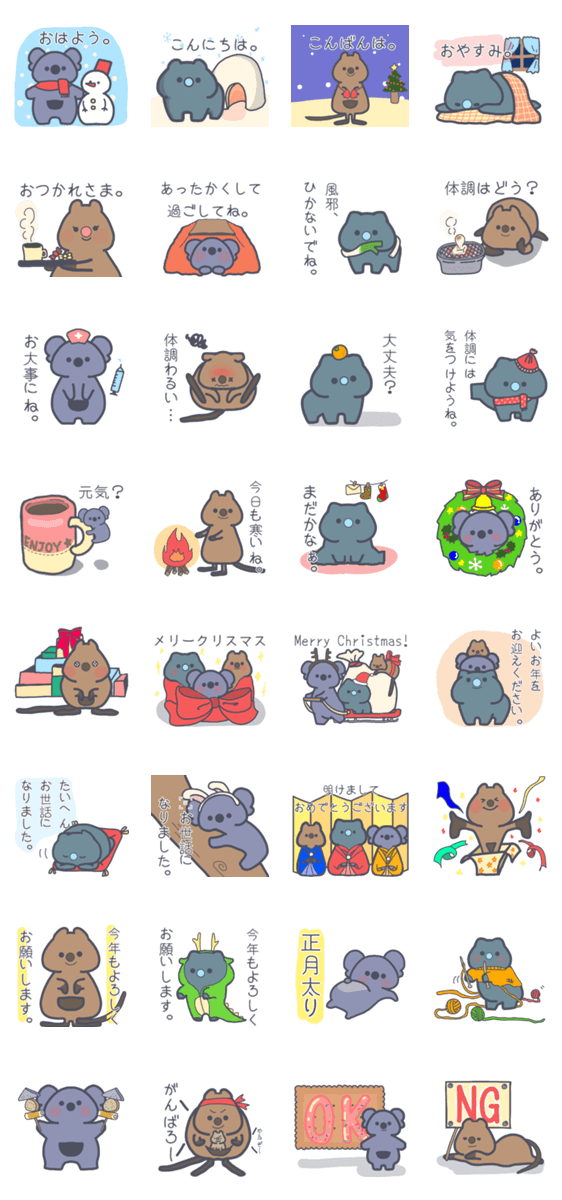 コアラ、クオッカ、ウォンバットの冬に使えるスタンプです。 年末年始の挨拶にも使えます。