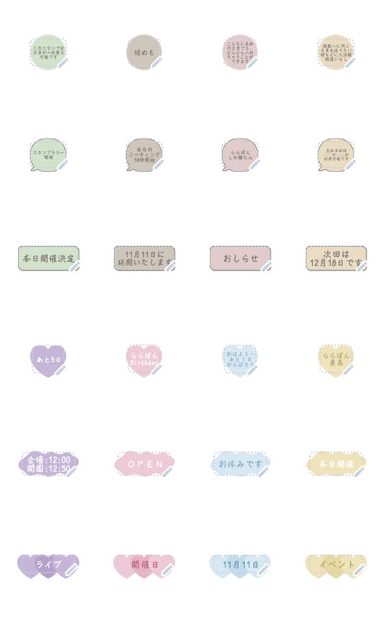 | スタンプ説明 | 癒しのくすみカラー♪結構小さめです♫推し活やビジネス、お仕事で利用する方、イベント主催者様にも。ヒーリング・浄化・やさしい・大人かわいい・メッセージスタンプ 現在この商品は一部のスマートフォン版LINE 10.3.0以上のトークルームでのみ使用できます。動作環境の最新情報はヘルプをご確認ください。 |