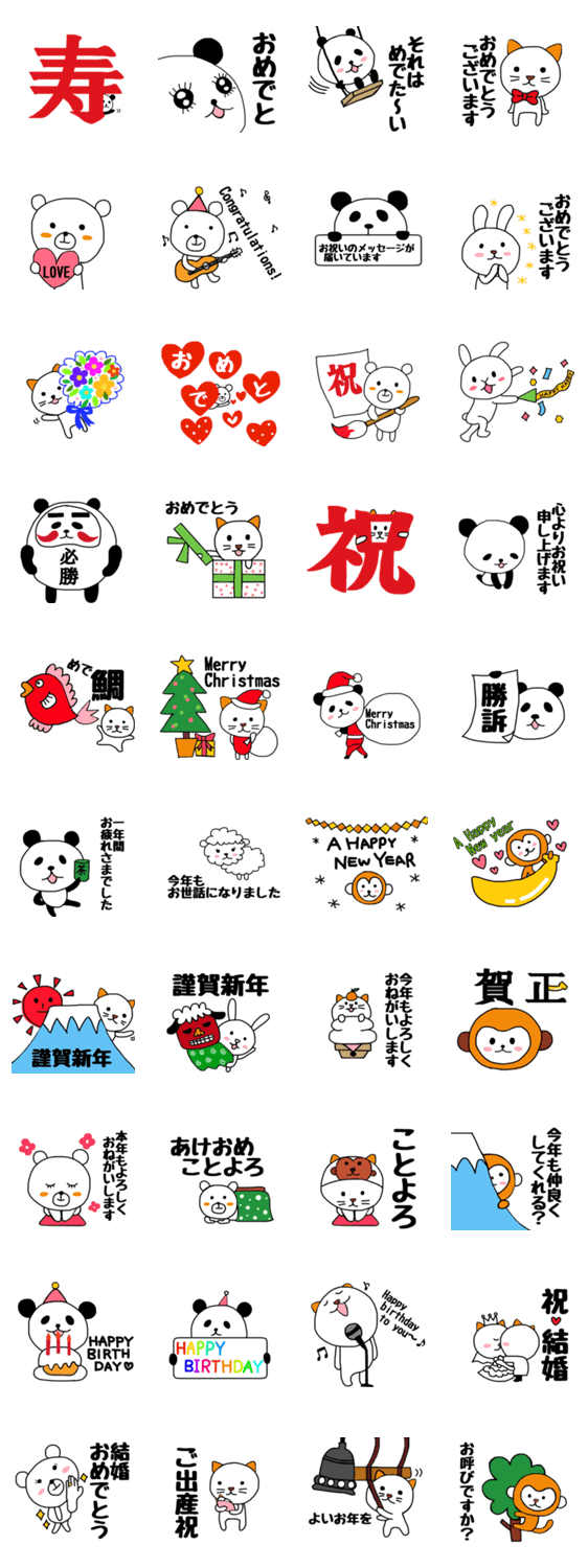 年末年始、クリスマスや新年の挨拶、記念日に使えるスタンプ。お祝いやおめでたい時に是非。可愛い動物たち(ネコ、クマ、パンダ、ウサギ)なので使ってやって下さい。
