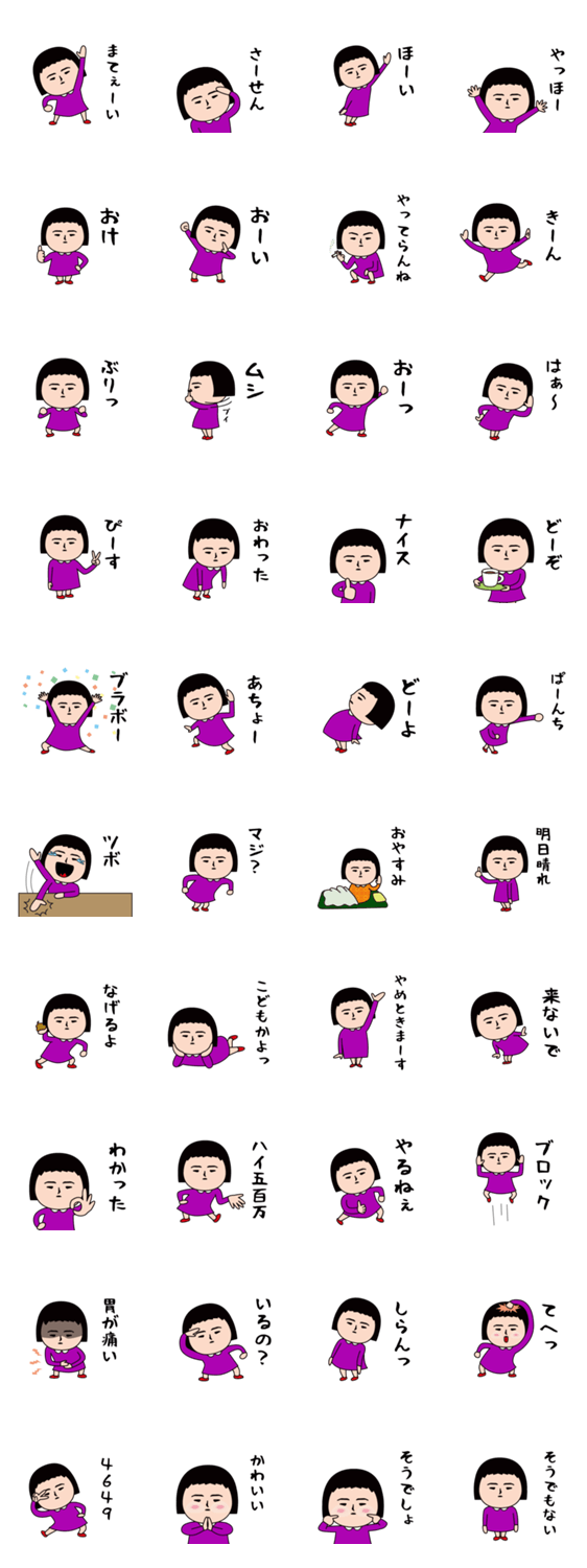 いつもの面白スタンプ。紫・パープルのワンピースがかわいい。