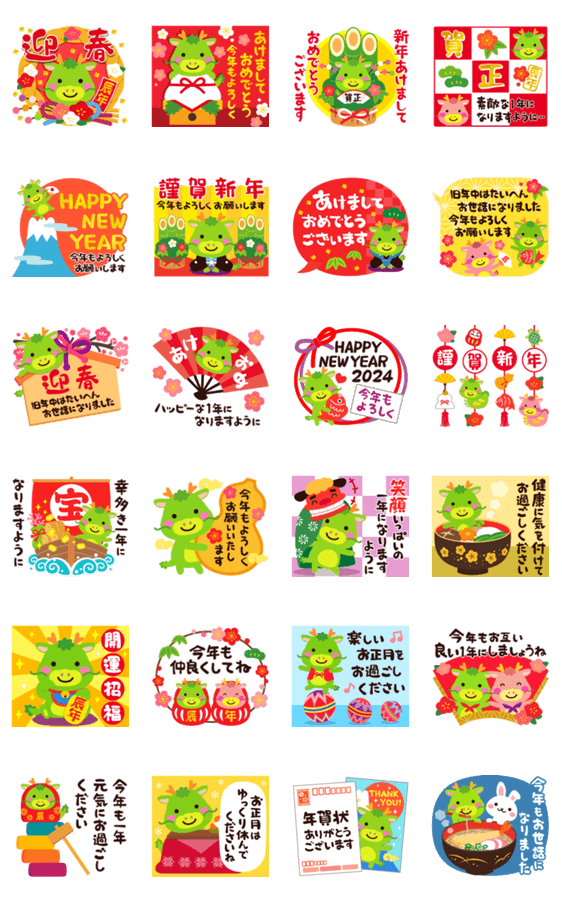 画面いっぱいに飛び出す、2024年辰年にぴったりのお正月スタンプ。ちょっとだけ大人の子供すぎない柄が使いやすい‼年末年始のご挨拶に大活躍です♪(あけおめスタンプ2024対象)