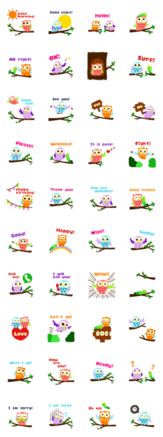 カラフルでポップな「ふくろう」と「いもむし」のスタンプ♪日常よく使う簡単な英語を集めています!