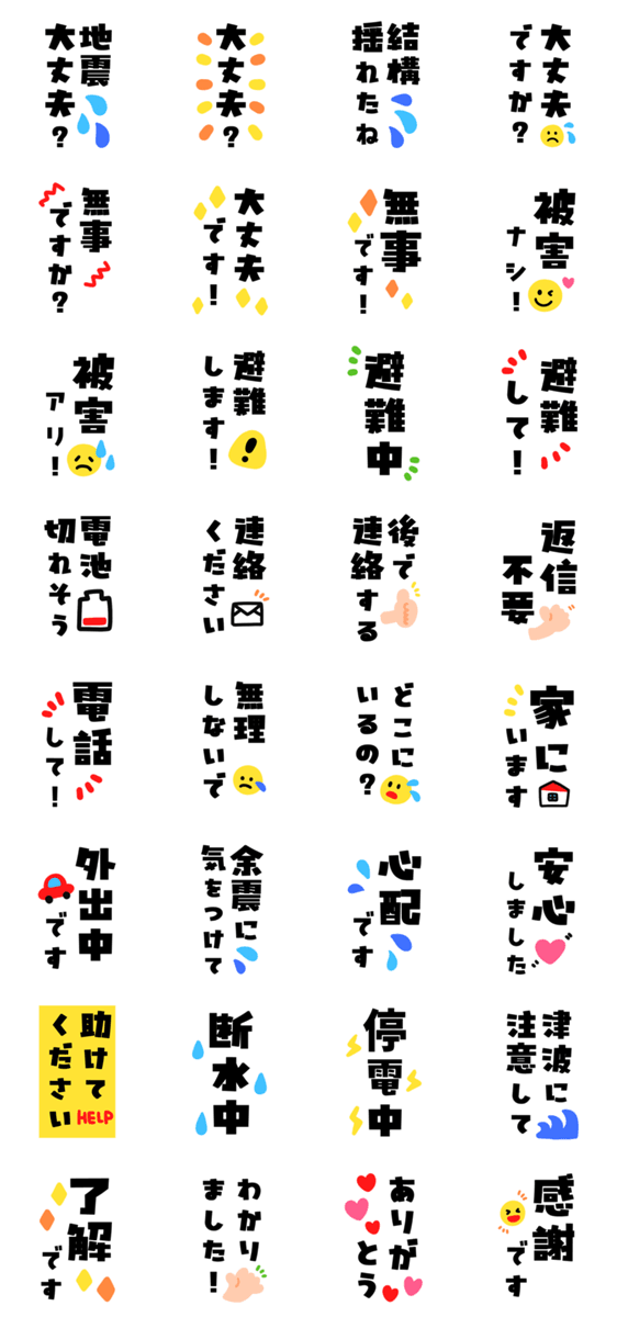 大きくて目立つ、震災、災害時の連絡スタンプです。1つあると安心です。大切な人へプレゼントにも。文字は白フチつき!地震/安否確認/見やすい/文/シンプル/緊急/津波/注意 ※このスタンプはトークルームで大きく表示されるBIGスタンプです。