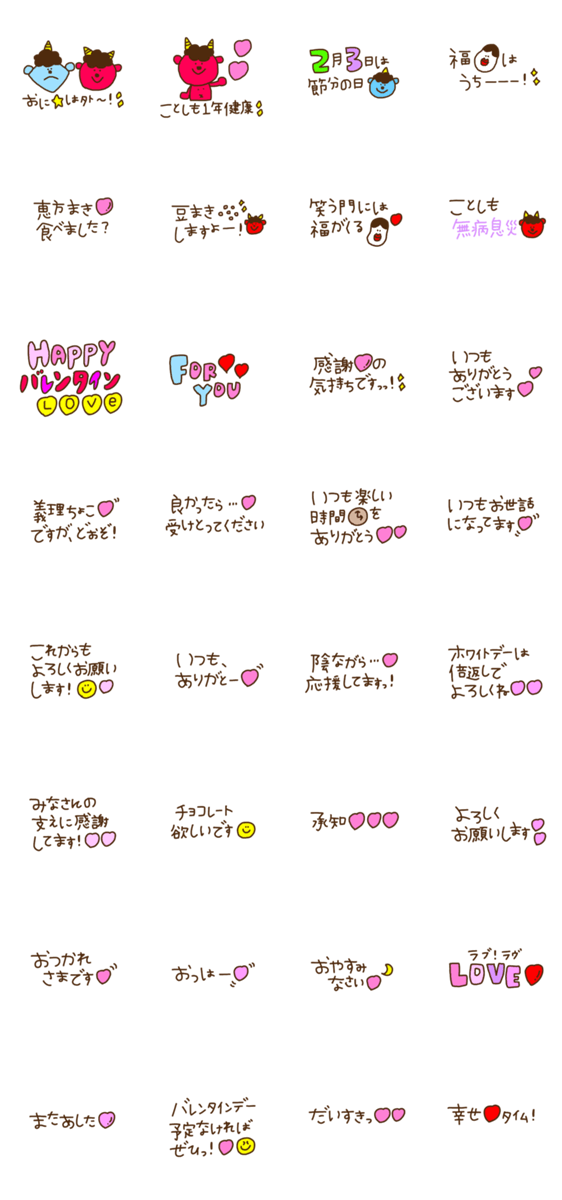 2月に使えるハート多めのスタンプです。 旦那さん、息子さん、上司に職場、友達にも使えます。 日頃の感謝の気持ちを使えましょう! チョコレート/節分/無病息災/