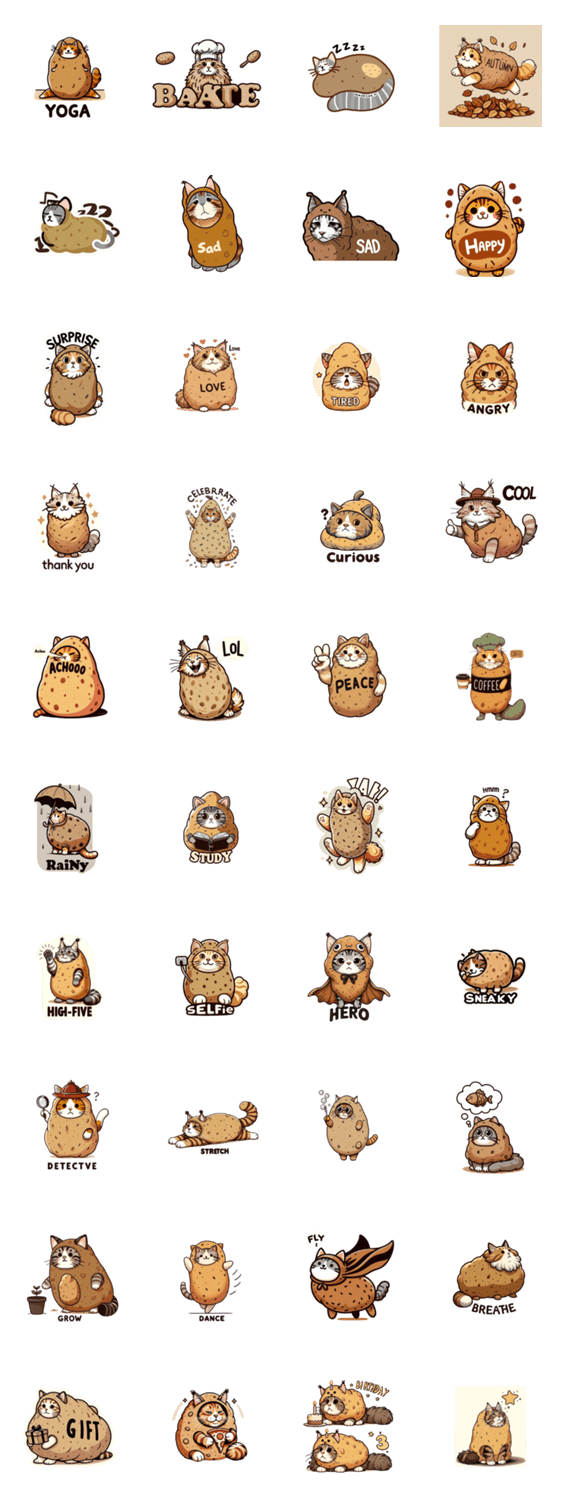 じゃがいもの着ぐるみを着た愛らしいメインクーンのキャラクター。日常のあらゆる気持ちを表現するための可愛くてユニークなスタンプです。