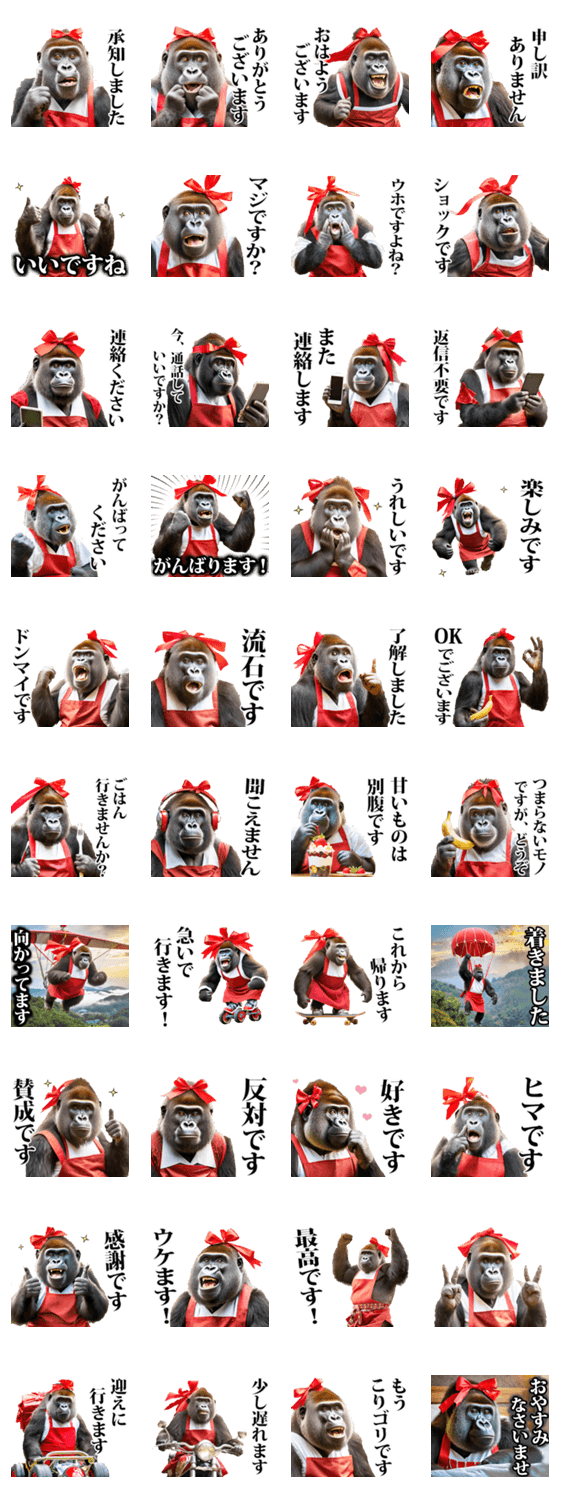 メスゴリラの敬語スタンプ。丁寧な言葉で使いやすいスタンプです!! 名古屋弁、広島弁、博多弁、関西弁、茨城弁、北海道弁などの方言ゴリラやオスゴリラも好評発売中です!!!