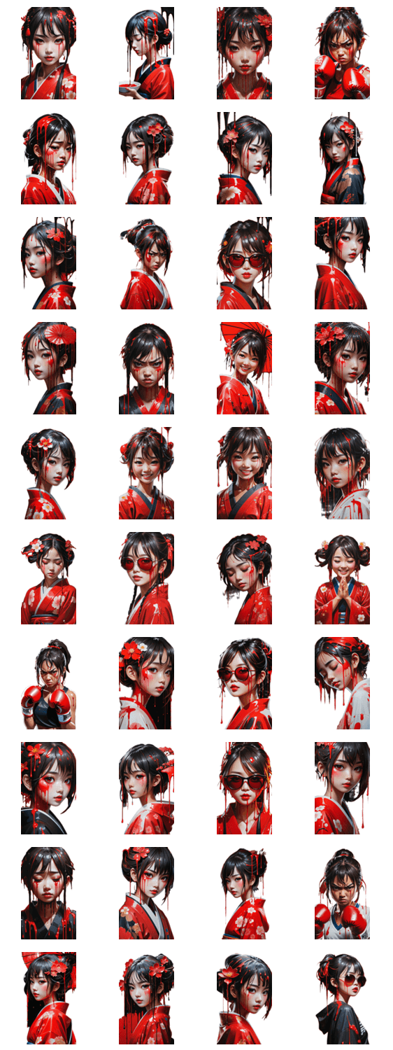 ペンキを塗られた着物の女の子、喜怒哀楽の表情。 ※このスタンプはトークルームで大きく表示されるBIGスタンプです。