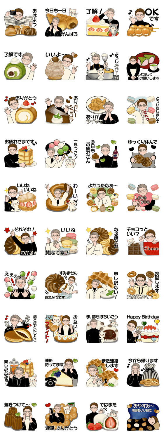 甘党の男性のために〜スイーツを添えた憩いの日常スタンプです。甘く、お茶目で楽しいスタンプで癒しと元気を運んでください。気分転換にどうぞ。