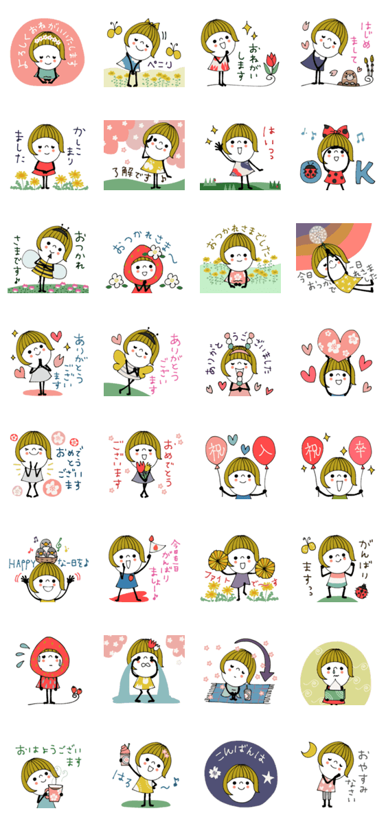 ぱっつんボブの春らしいスタンプです♪いろんなシーンで使えます♪
