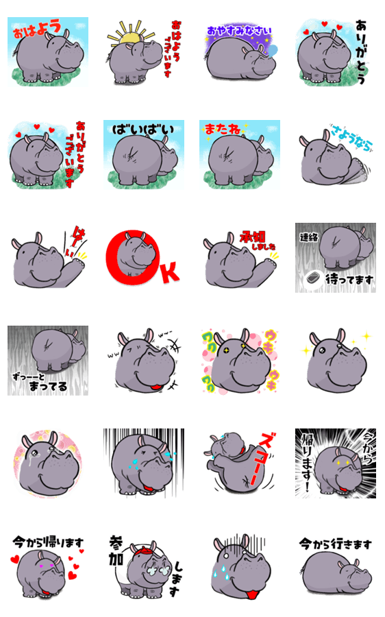 カバのパパちゃんの普段使い出来るスタンプです。敬語挨拶も入っているよ。