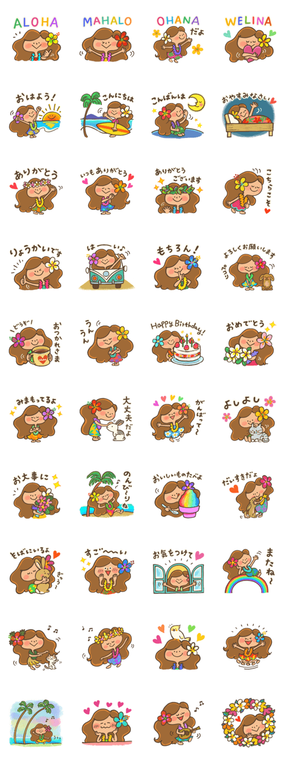 寄り添ったり、励ましたり、ほっこり温かいスタンプがたくさん♡フラガールKAPUAが、定番のご挨拶と一緒にやさしい気持ちになるスタンプをお届けします♪