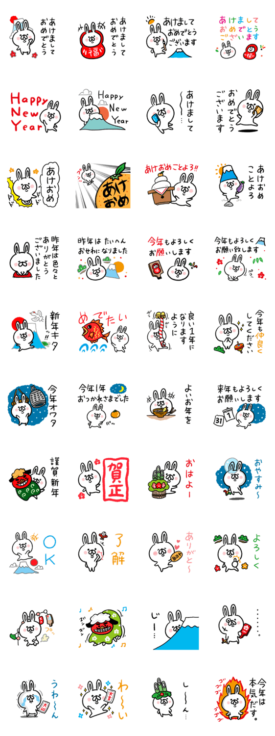 ウサギのあけおめスタンプ。毎年使える絵柄です。大晦日・年末年始・正月・年賀状・冬休みなど。新年の日常会話系もあり。2016年あけましておめでとう!Happy New Year!