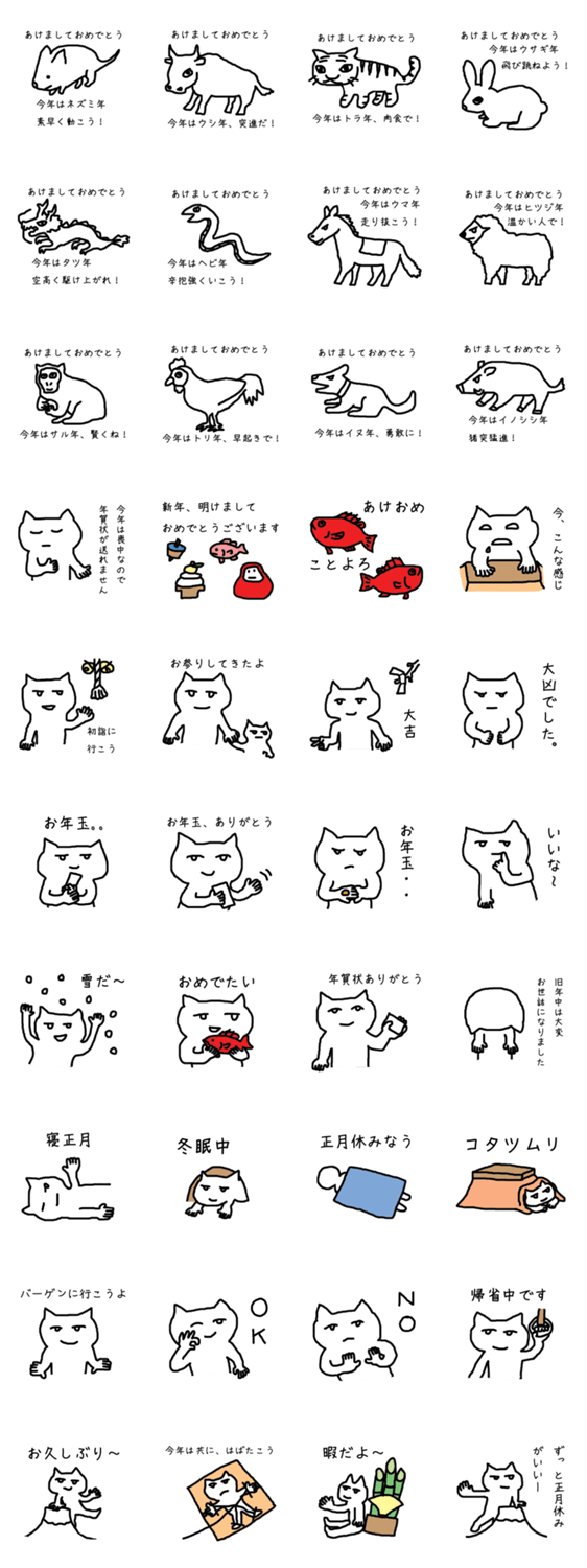 前半は年賀状として使用できるスタンプです。後半はお正月前後のやりとりにピッタリ。