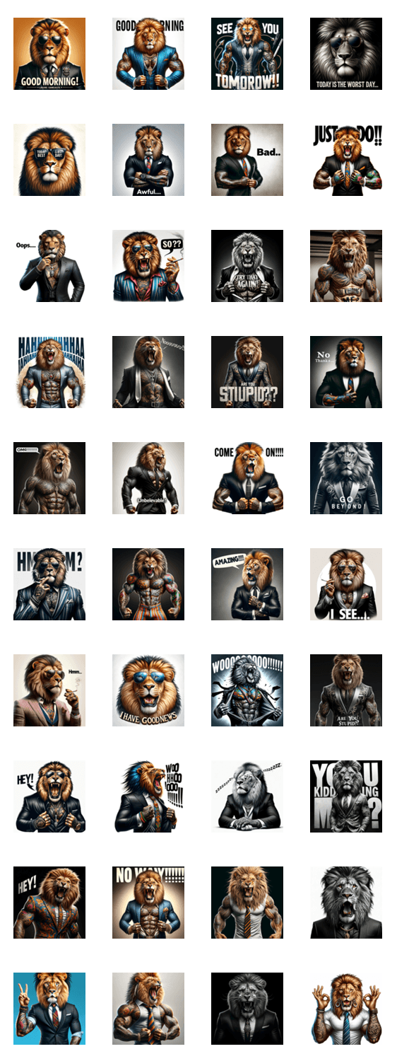 スーツを着たライオンがビジネス界を席巻!ワイルドでいかついその姿を40種のスタンプで。メッセージに迫力を。