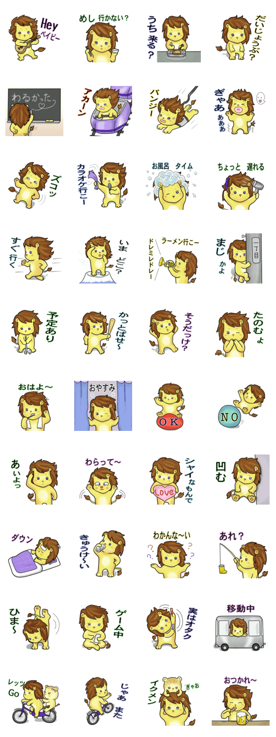 たてがみヘアーがチャームポイントの♂ライオンのスタンプです。 イケメンと言うより、ツケメンな感じ。 チャレンジ精神旺盛なライオン君です。