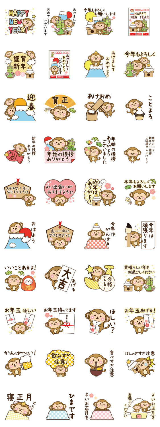 おさるのあけおめスタンプです。あけましておめでとう、今年もよろしくなど年始、お正月、新年のご挨拶にお使いください!年賀状にもどうぞ!目上の方に送れる敬語付き!