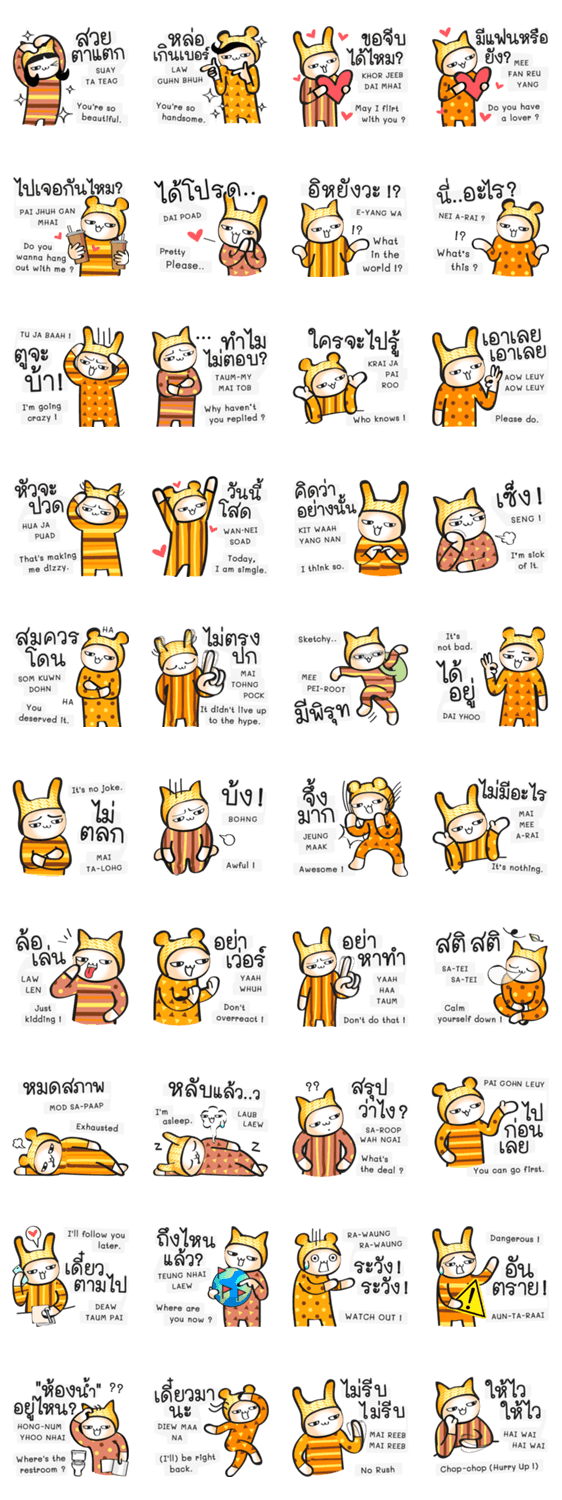 | スタンプ説明 | English to Thai, Speak and learn Fun Thai Slangs and Idioms with your english and romanized text to connect with locals and make new Thai friends. |