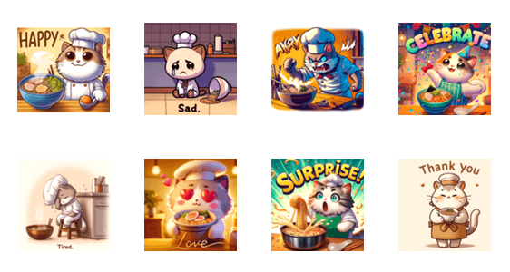 このスタンプセットで、猫ラーメンシェフの楽しくて美味しい日常を共有しましょう!幸せから驚きまで、猫の表情があなたの気持ちを代弁します。