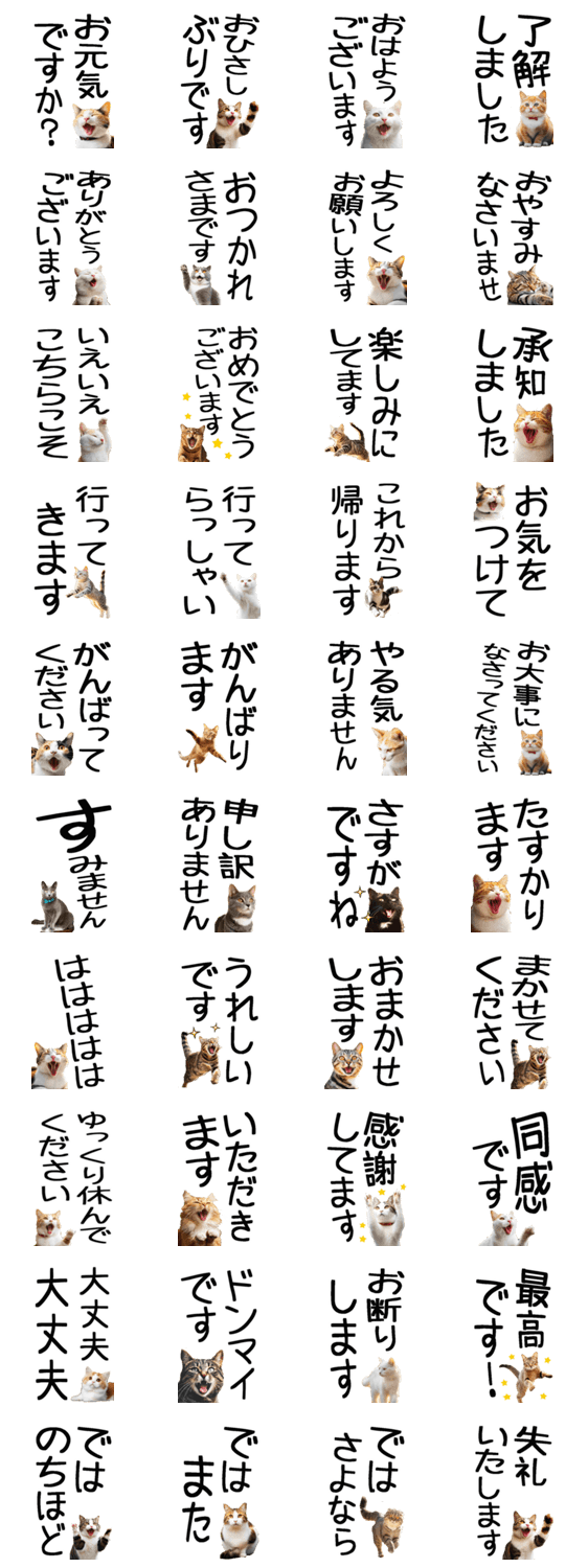 | スタンプ説明 | 老眼の方や、小さな文字が苦手な人のための、大きな文字の丁寧な言葉スタンプです。かわいいにゃんこが日常を癒やしてくれてますよ。猫ちゃんが好きな方使ってくださいね!! ※このスタンプはトークルームで大きく表示されるBIGスタンプです。 |