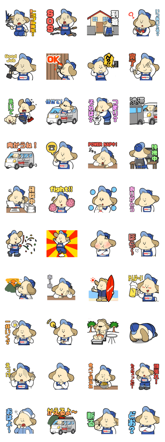 家の修理が大好きなハンディマン君の日常スタンプです。色々な場面で使うことが出来るカワイイ ワンちゃんです。