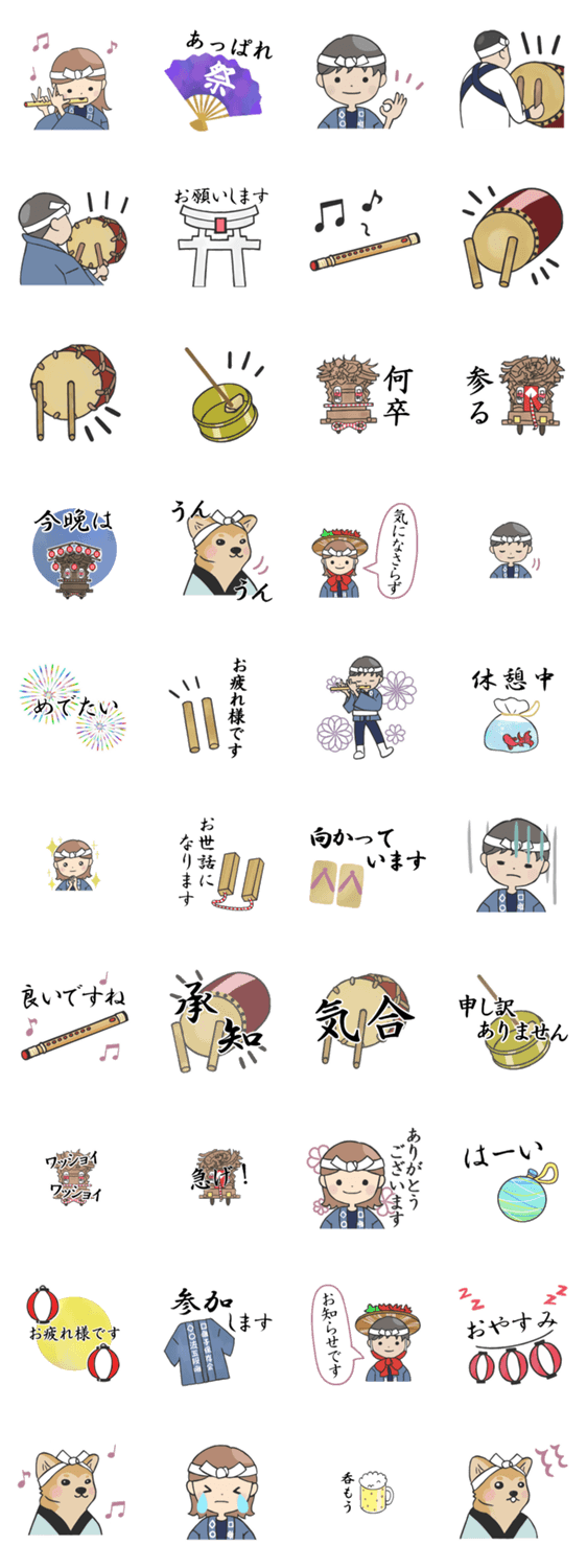 和太鼓・篠笛・彫刻屋台・祭が好きのためのスタンプです。スタンプを白で囲ってあり見やすくなっています。