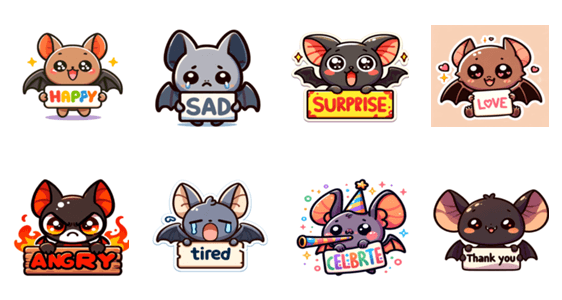 様々な感情を表すかわいいコウモリのスタンプセット。喜び、悲しみ、驚き、愛情、怒り、疲れ、祝い、感謝の感情が満載。日常のコミュニケーションに最適。