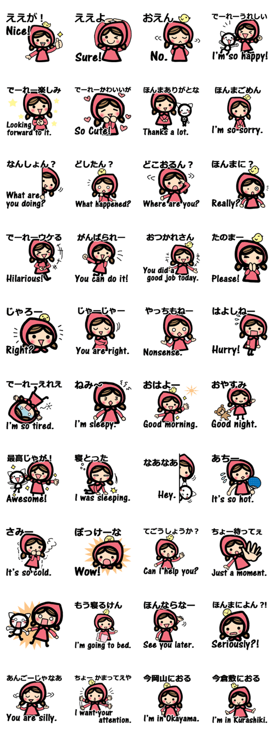 岡山弁と英語のスタンプ。岡山在住の外国人の友達や、英語・英会話を勉強中の友達に。岡山にゆかりの無い人でもどうぞ!たまにネコやコトリが現れます。
