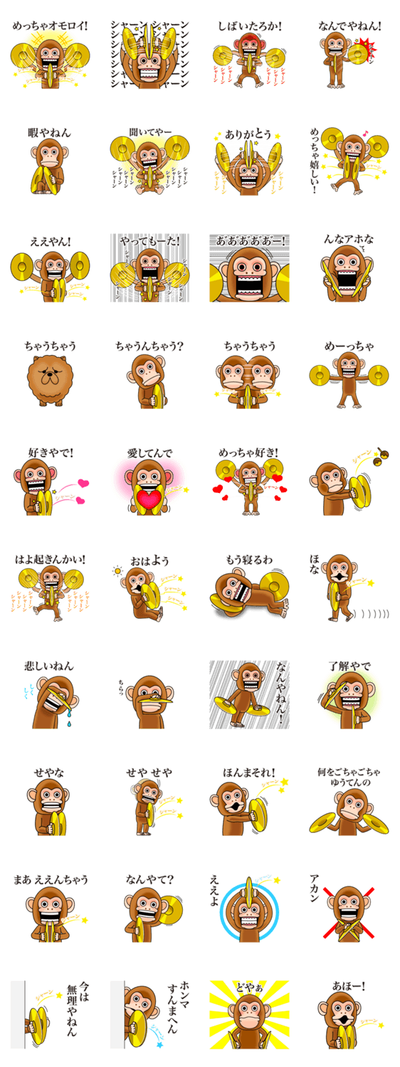 楽しいシンバルお猿の関西弁スタンプ。ちゃうちゃうちゃうんちゃう? シャーン♪