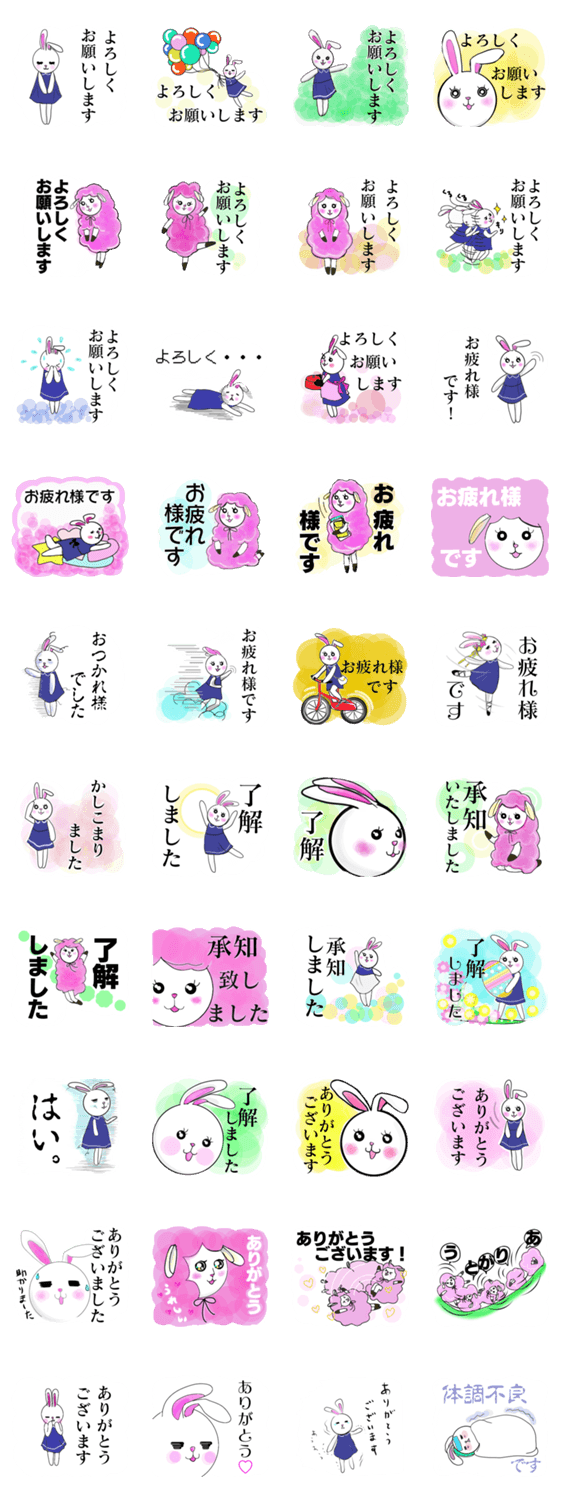 ほんわか可愛いうさぎと、ほわほわ羊のスタンプです。ありがとう、よろしくお願いします、了解しました、お疲れ様ですに特化しました。仕事に、ママに同士に、使えます。
