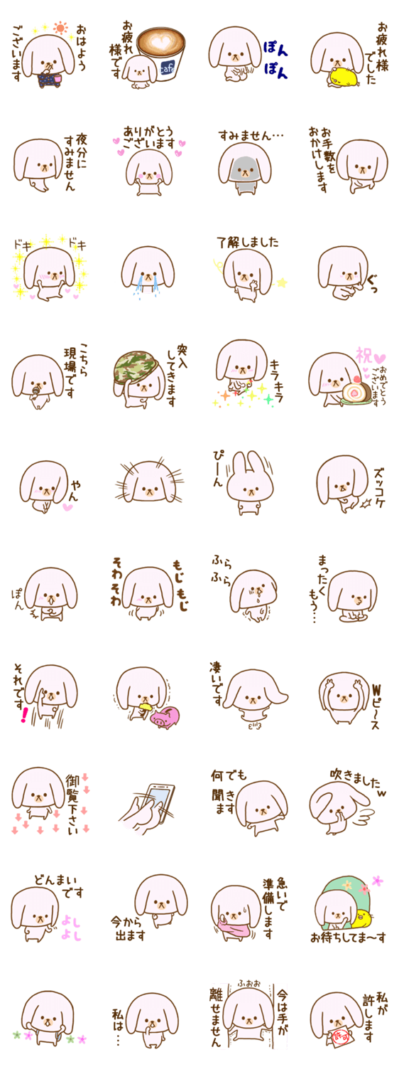 可愛い、たれみみのウサギ。丁寧語だけど少しシュールで、癒し系ラブリーな、うさぎちゃん。日常会話。よく使う挨拶など言葉がいっぱいです。ひよこも登場。