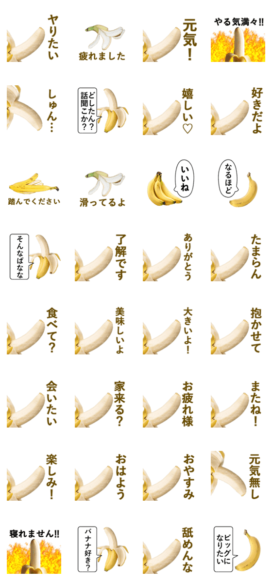 毎日使えるバナナのスタンプです。日常で使いやすいフレーズが収録されています。