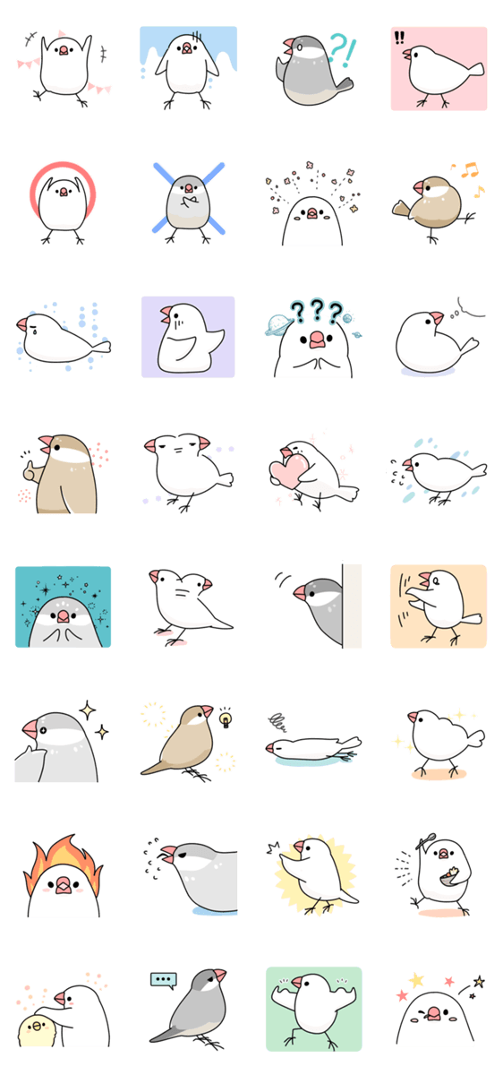 文鳥たちがおちゃめなジェスチャーで気持ちを伝えてくれるスタンプです。ほぼイラストのみで様々な相手・シーンでお使いいただけます。