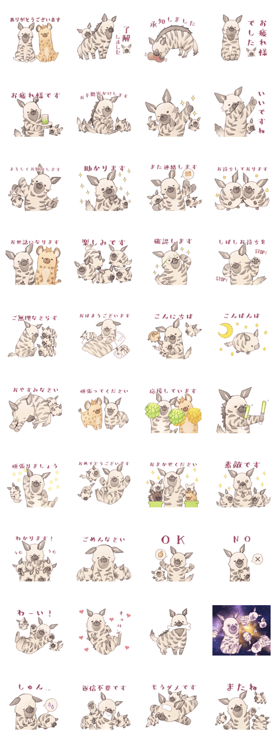 シマハイエナさんがスタンプになりました。敬語スタンプになっているので、お仕事にもプライベートにも家族でも使えます。お友達のブチハイエナさんもゲストで登場。