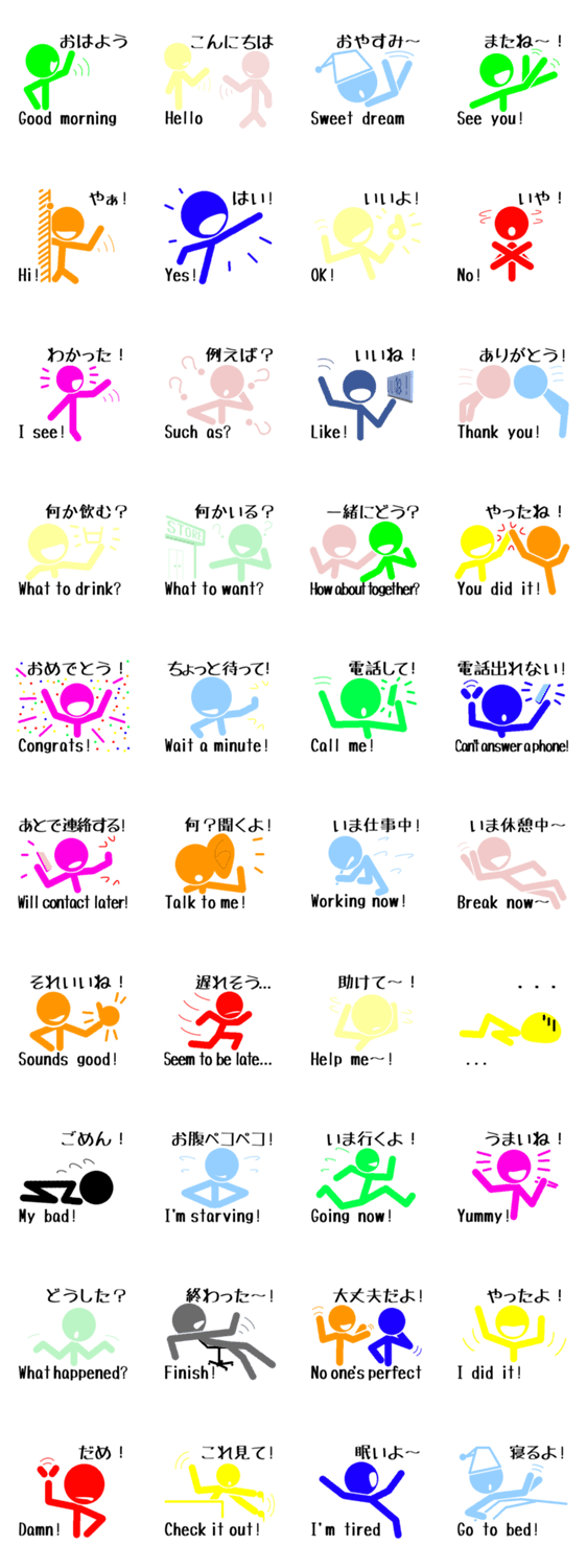 若干バイリンガルなカラフルスティックマン(色付き棒人間)があなたの気持ちを伝えます。感情によってちょっと色付きますので、メッセージの間を華やかに楽しんで下さい。