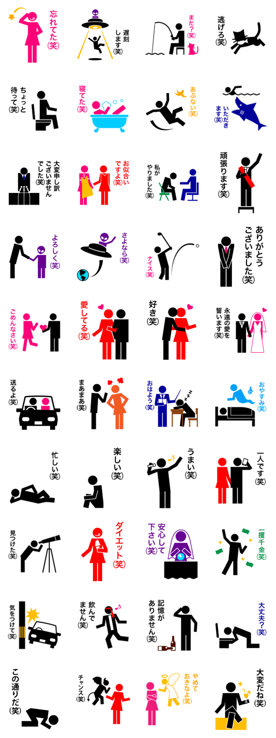 ピクトの日常がスタンプになりました(笑) 男と女・宇宙人・猫にサメ…ピクトグラムの世界の住人たちによるカッコワライワールド!いろんなシチュエーションを楽しもう!