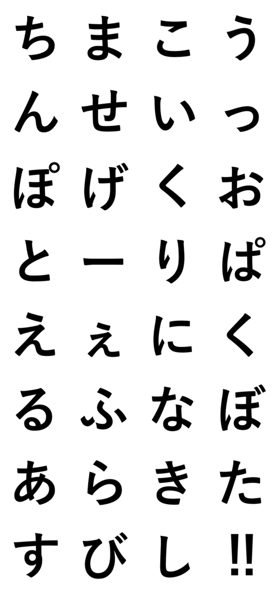 なにかと便利な文字を収録しています。芸術性と汎用性を備えています。スタンプアレンジ/面白い/シュール/ネタ/ひらがな/テキスト/日本語/デカ文字