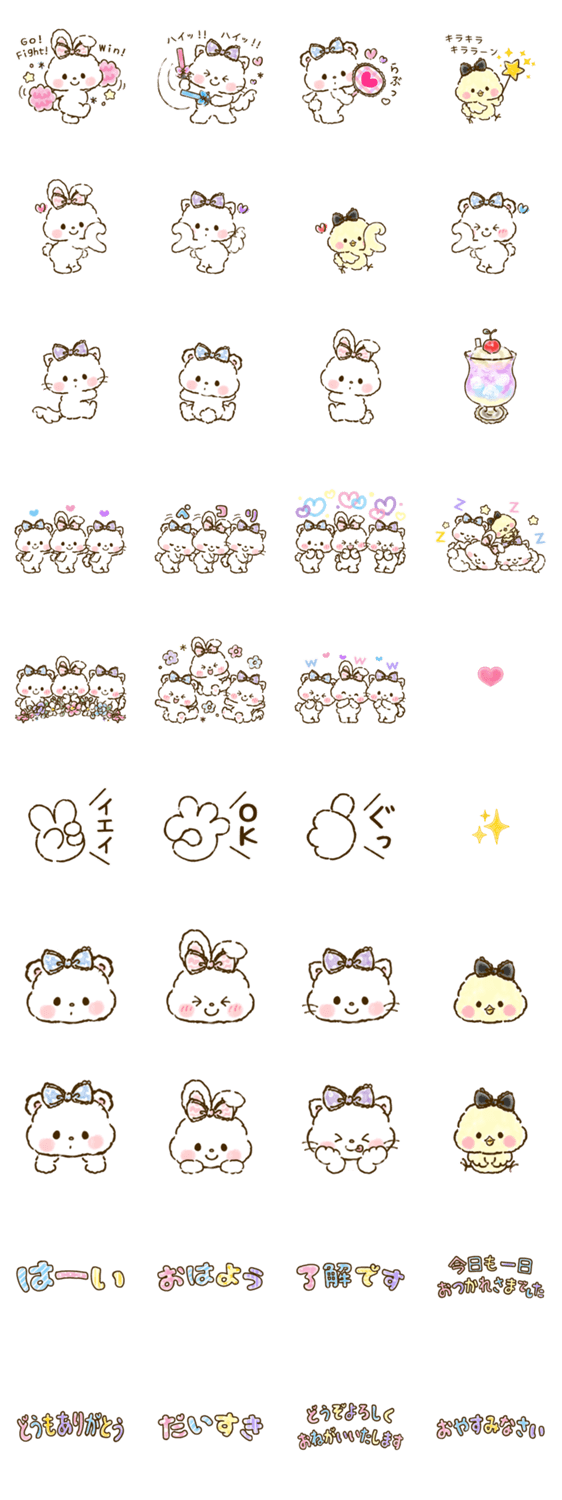 リボンギャルズ(うさぎりぼん、ねこりぼん、くまりぼん、とりりぼん)の、写真に貼ったりスタンプアレンジ機能で組み合わせたりして遊べるスタンプです。挨拶/推し活/応援