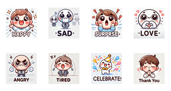 このスタンプセットには、喜び、悲しみ、驚き、愛情、怒り、疲れ、祝う、感謝の8つの感情を表現するかわいいキャラクターが含まれています。