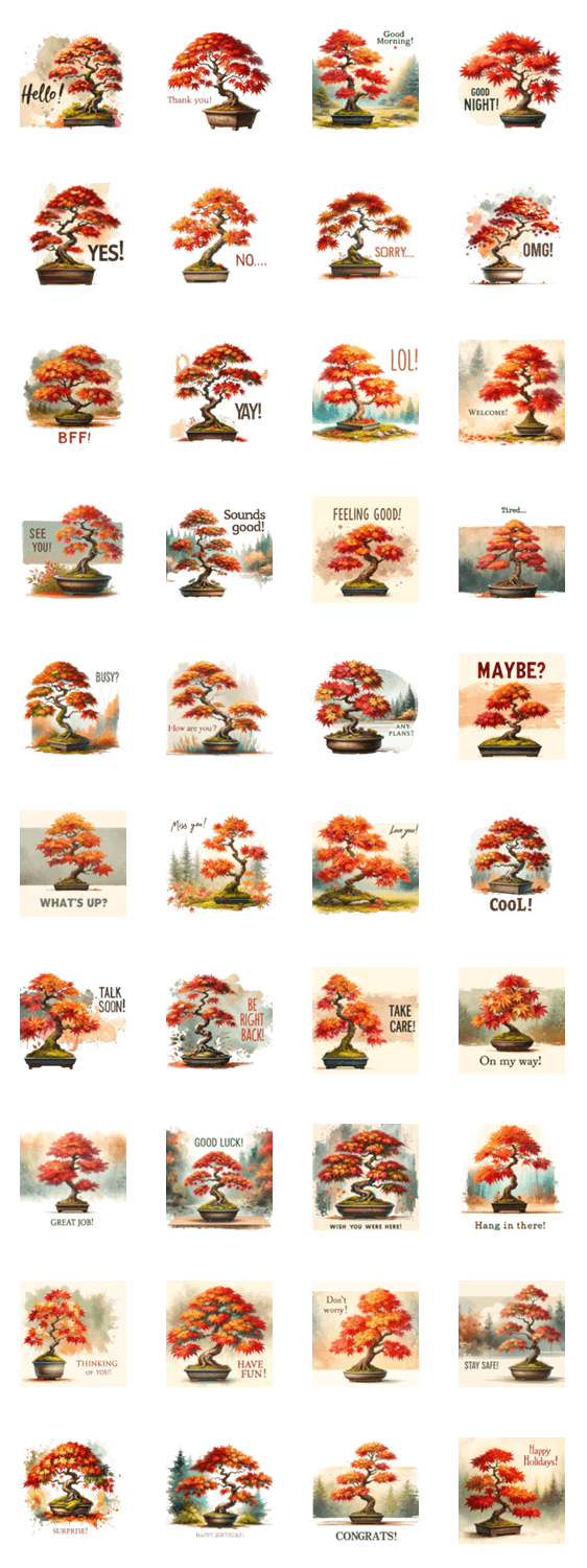 水彩画風で表現されたリアルで渋い紅葉のモミジ盆栽のスタンプ。チャットに自然の美しさを加えましょう!