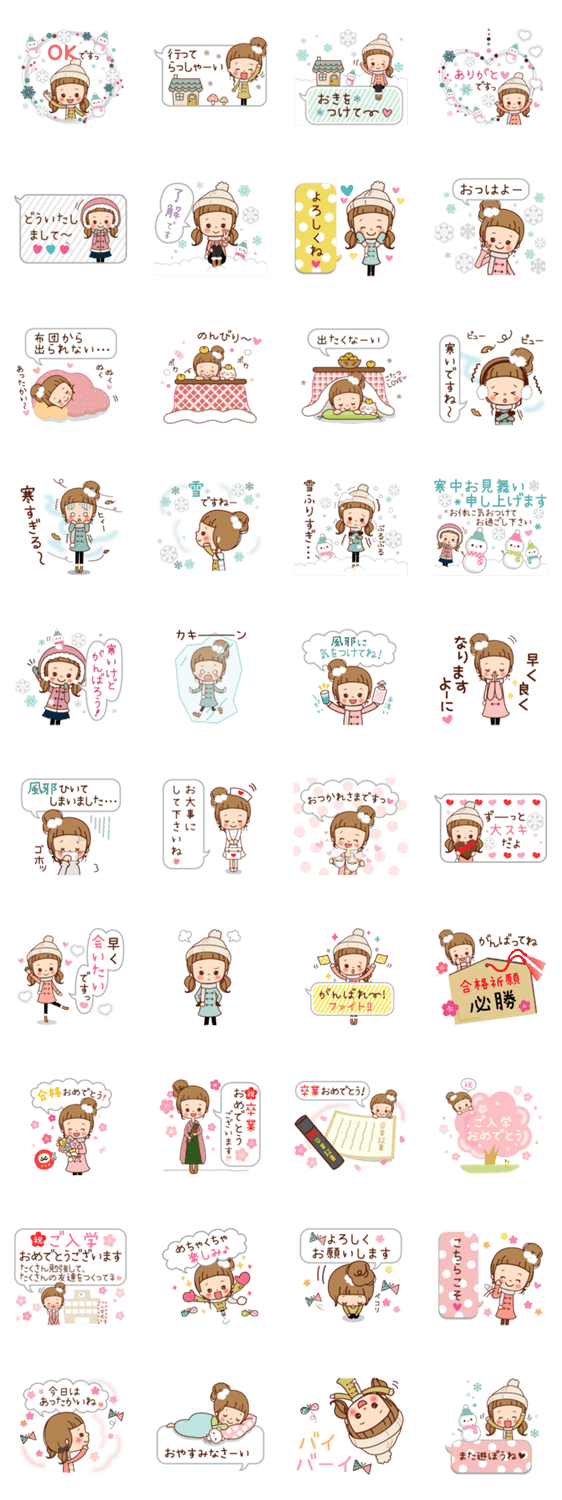 冬から春まで使えるスタンプです。季節の挨拶や日常会話、バレンタイン、受験、卒業、入学などなど。ふきだし多めで使いやすい♥︎