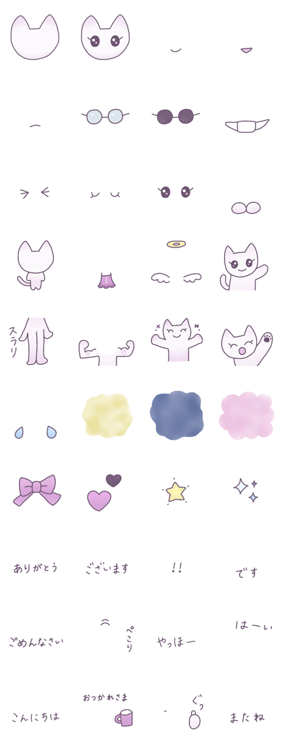 猫のにゃみさんの、組み合わせて使えるスタンプです。組み合わせ方色々!遊んで楽しんで使ってください。