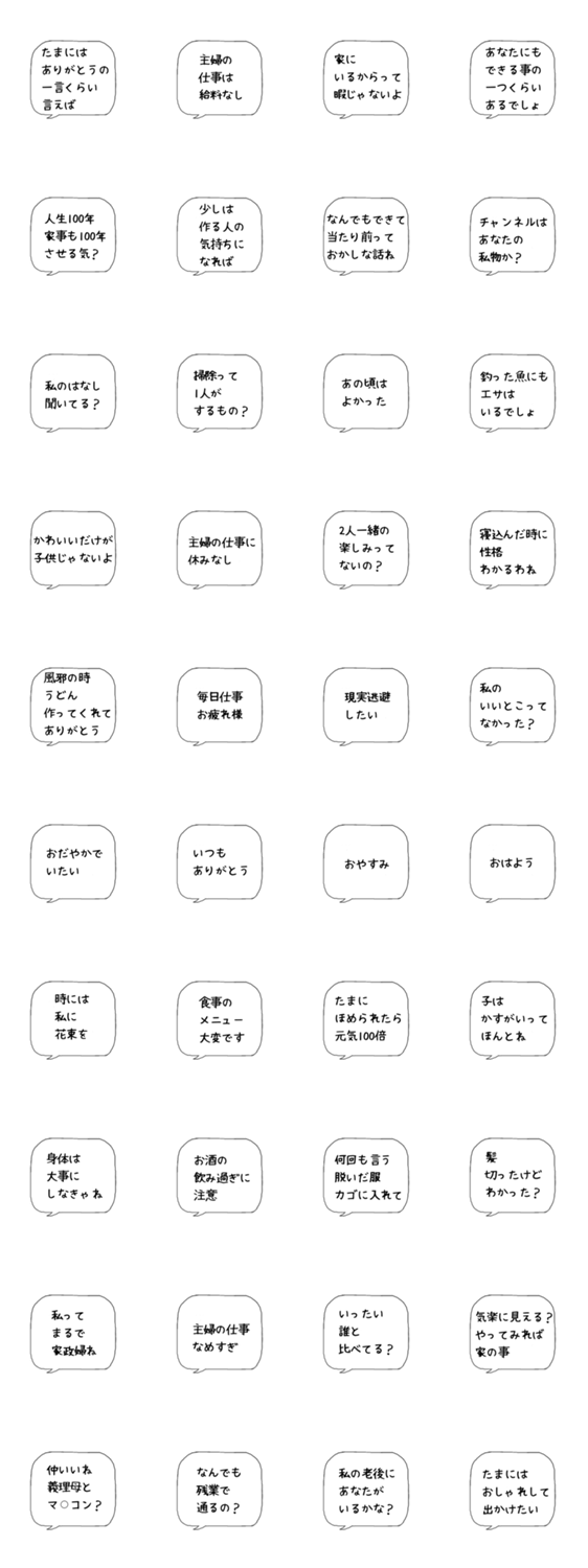 吹き出し、主婦、夫、旦那、夫婦、母、彼氏、家族、友達、独り言、ぼやき、ストレス解消、ママ友、マンネリ、共感、仮面、日常、生活、毎日、笑える、おもしろい