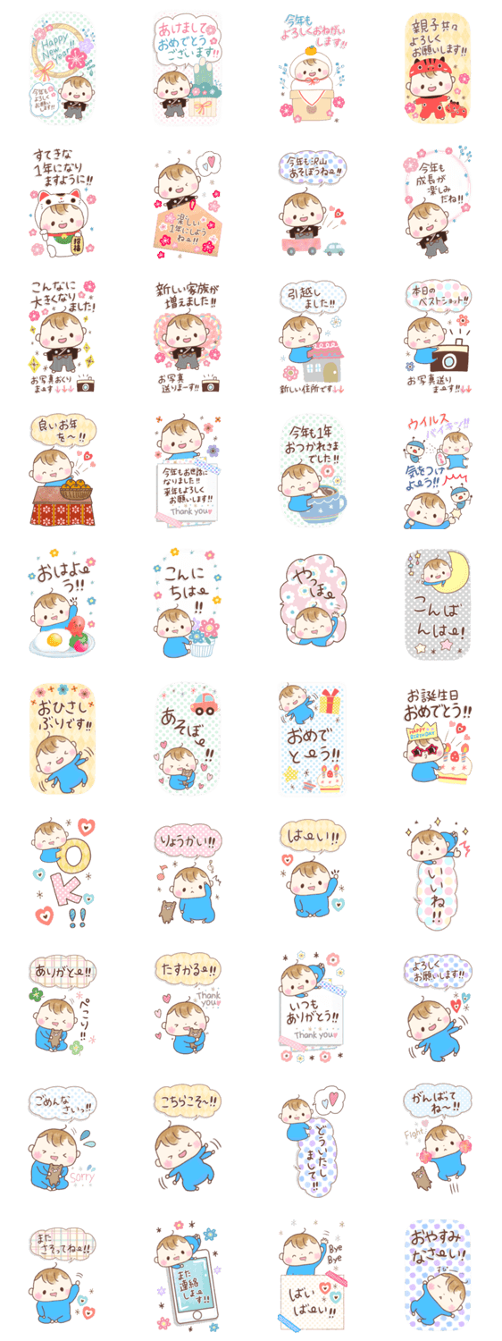 年末年始お正月年越しだけでなく日常会話入りで毎日使えます。子供や孫の成長報告近況報告引越しにも。こちら男の子赤ちゃんバージョン、子育てママパパ出産祝いにおすすめ ※このスタンプはトークルームで大きく表示されるBIGスタンプです。