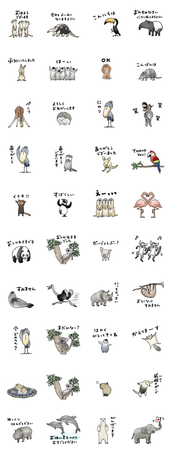 野生動物たちとハシビロコウの日常会話スタンプです。#ミナミコアリクイ #バク #オラウータン #カバ #ナマケモノ #モモンガ #アルマジロ #アライグマ
